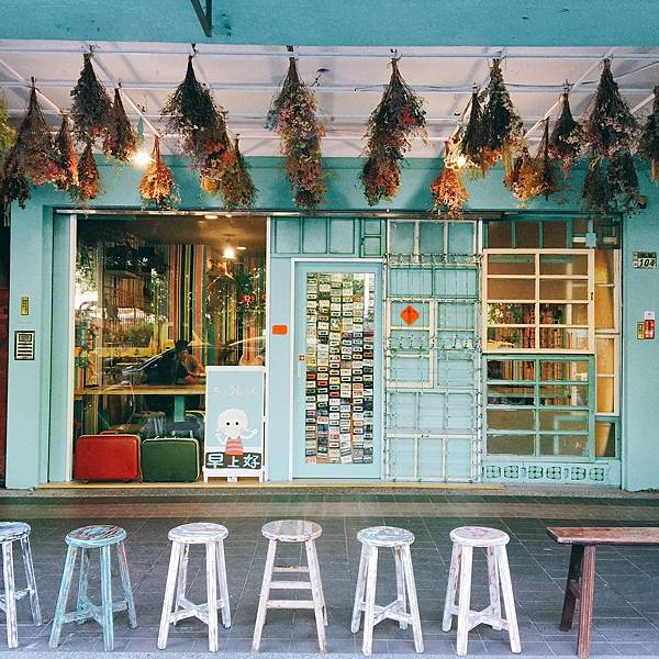 店門外的天花板懸掛了很多乾燥花束,騎樓下排了一排坐凳