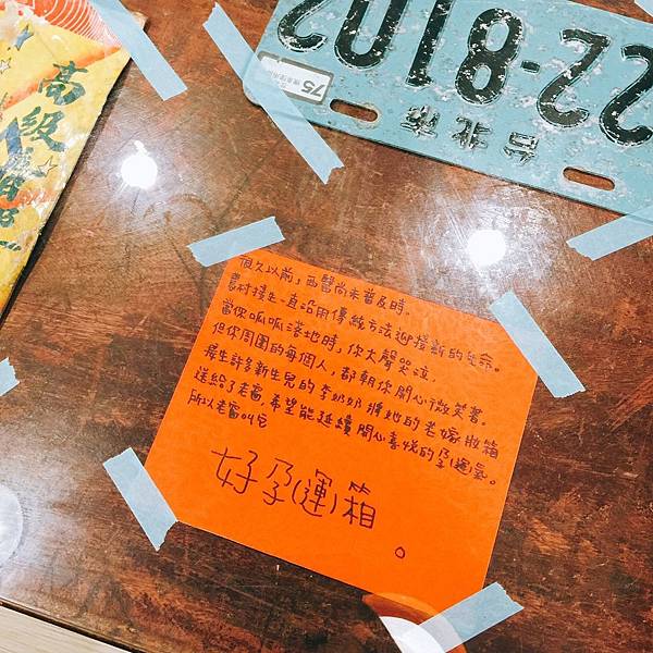 雙人座位用來當桌子的好運箱,紅色紙條上寫著溫馨的小故事。