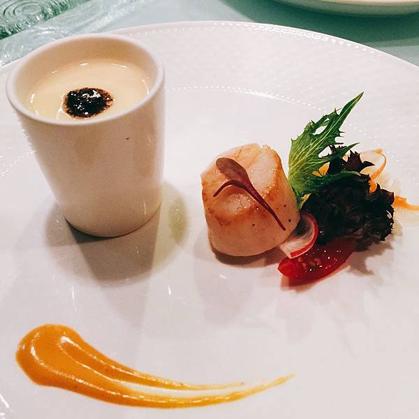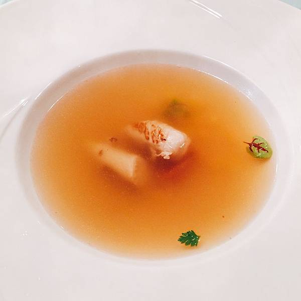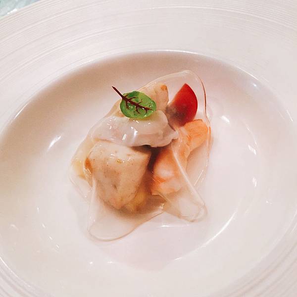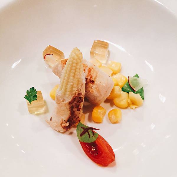 旁邊佐以一些玉米粒,以及一小塊一小塊透明方塊狀那個是蔬菜高湯凍