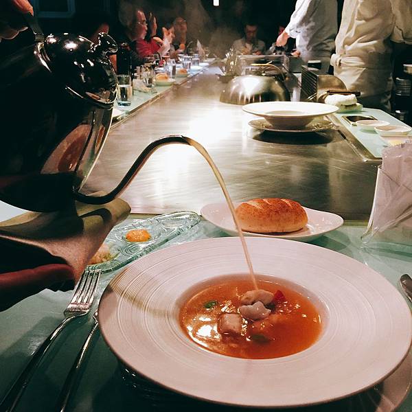 服務生會緩慢注入海鮮高湯,讓被被融化,與海鮮們融合在一起