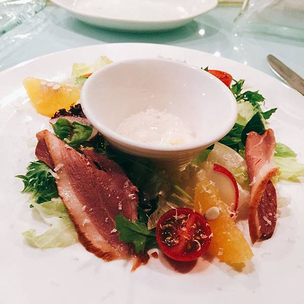燻鴨香鹹配著新鮮爽脆生菜與凱薩醬