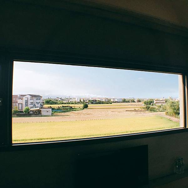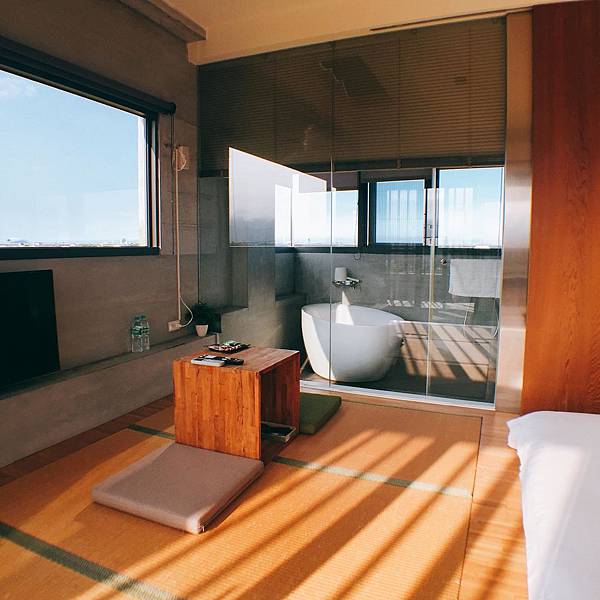 正方形的房間,有榻榻米地板,電視、小方桌、座墊,還有一片很大的對外窗