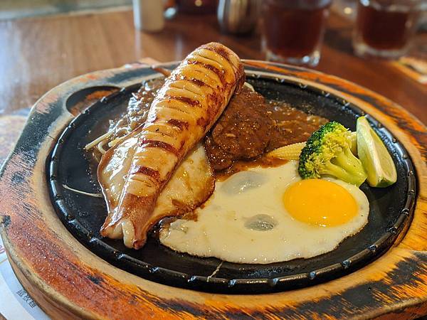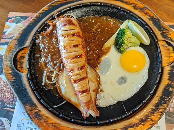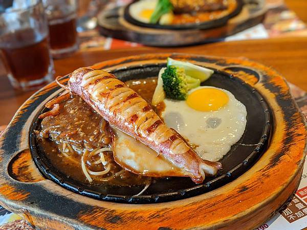 炙烤鮮魷併炙烤牛排(黑胡椒醬) 450元