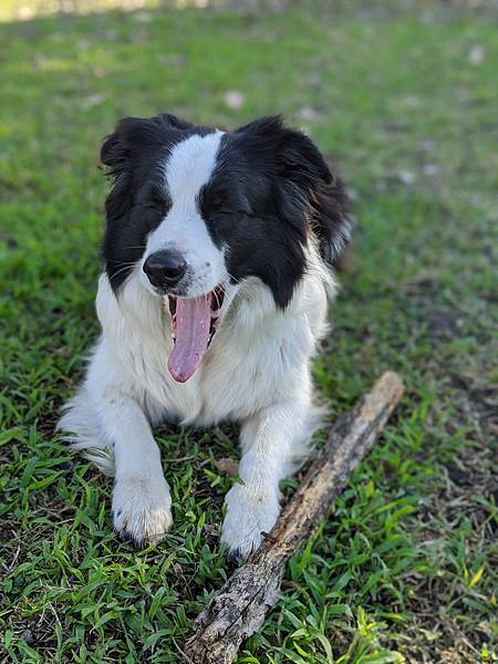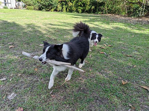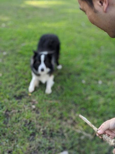 照片中正是在我們腳邊任性丟下一根木頭就要飛奔開始玩的狀態