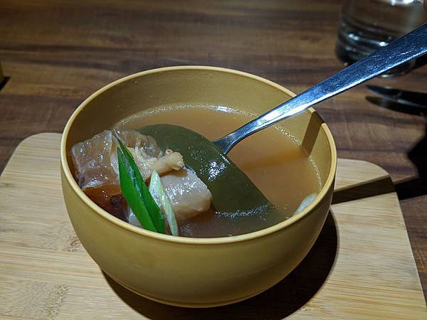 小小一碗湯裡頭有三、四塊牛筋,菜單上說花了八個小時來燉煮,讓它入口即化