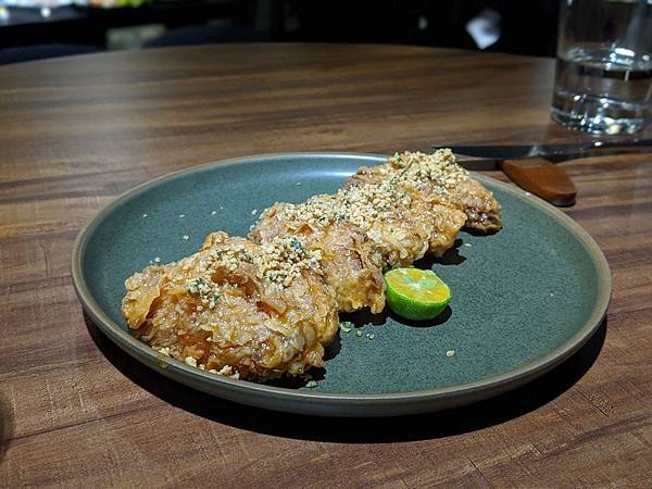 炸過的雞翅裹了一層硬的糖衣像糖葫蘆一樣,上面灑了花生碎片、檸檬葉香料