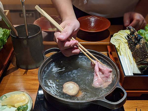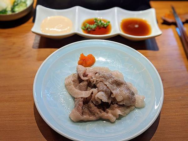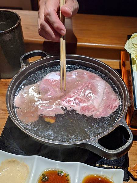 我的火鍋部份,師傅先下了三片肉,建議我吃原味看看