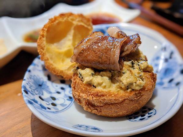 吃到一半就看到師傅在後台炙燒和牛,製作了這份松露蛋泡芙!