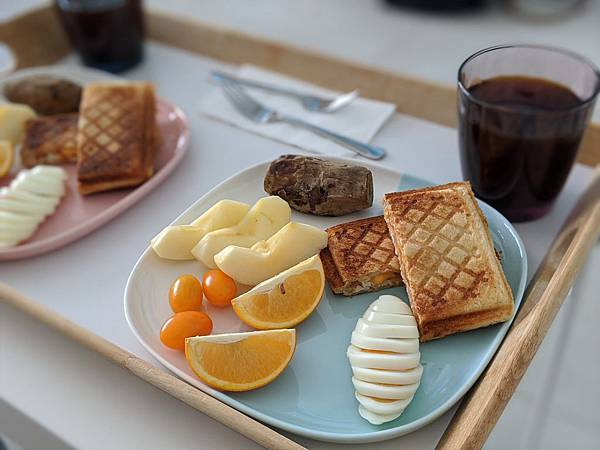 餐點有熱壓土司、地瓜、水煮蛋和水果